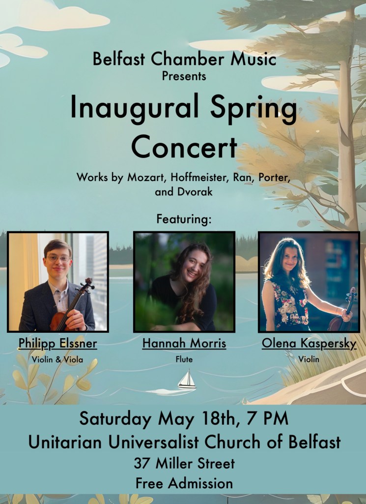 On Saturday, May 18th, at 7:00 PM, Belfast Chamber Music presents its inaugural spring concert at the Unitarian Universalist Church at 37 Miller Street in Belfast. The program, inspired by the coming of spring, features classical solos, duos, and trios by composers such as Mozart, Hoffmeister, and Dvorak. Additionally, the program highlights lesser-known twentieth century composer Quincy Porter and living composer Shulamit Ran. Local performers Philipp Elssner, violin/viola, and Hannah Morris, flute, are joined by guest artist Olena Kaspersky, violin, in presenting this concert of engaging music accessible to both classical music fans and newcomers.